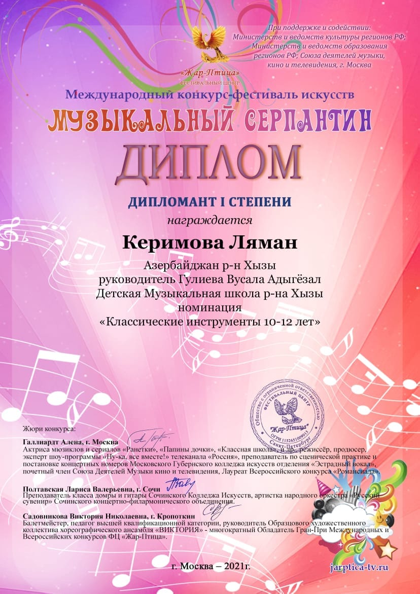 Sumqayıt Regional Mədəniyyət İdarəsinə tabeli Xızı rayon uşaq musiqi məktəbinin fortepiano ixtisası üzrə 5-ci sinif şagirdi Ləman Kərimova Rusiya Federasiyasının Moskva şəhərində keçirilən Beynəlxalq "Jar-Ptitsa" onlayn Musiqi Festivalında iştirak edərək I dərəcəli Diplomant adına layiq görülüb. Müəllimi Vüsalə Adıgözəl qızı Quliyeva təşəkkürnamə ilə təltif olunub.