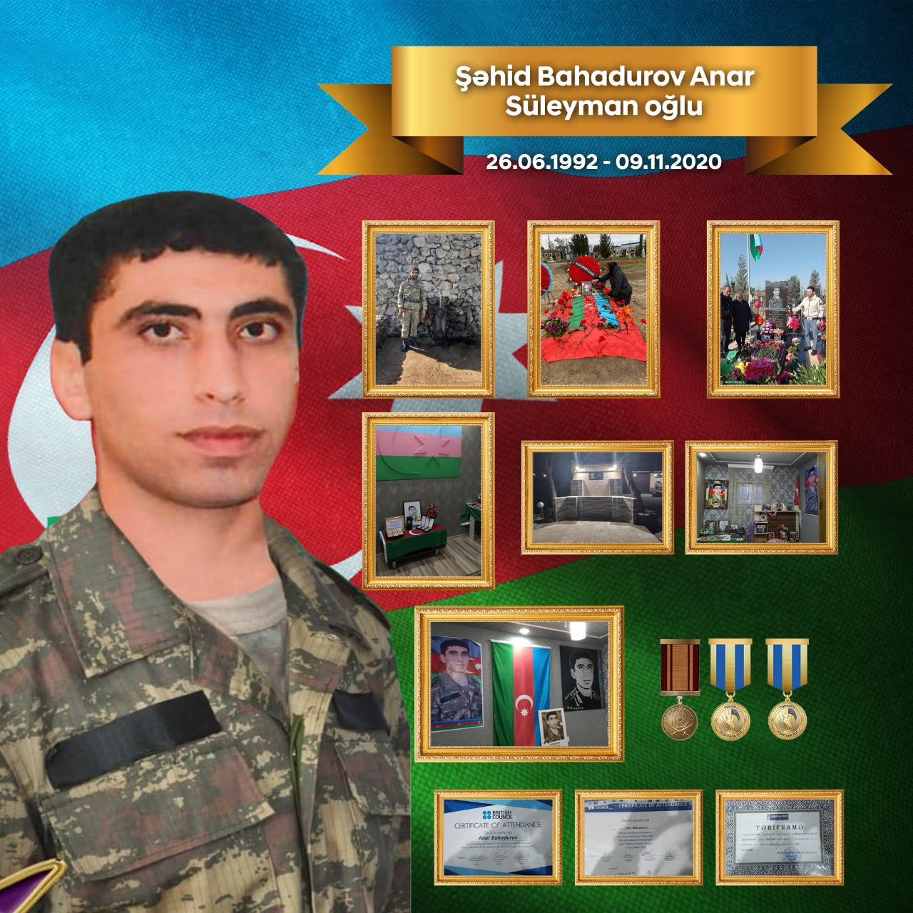 Adıçəkilən müəssisələr tərəfindən ailəsi ziyarət olunan digər qəhrəmanımız isə Silahlı Qüvvələr günü anadan olan, Zəfər günü şəhid olan Anar Bahadurov Qubadlıdan Şuşaya gedərkən 30 döyüş yoldaşını ölümdən xilas edərək şəhidlik məqamına ucalıb.