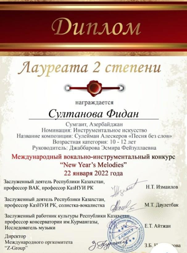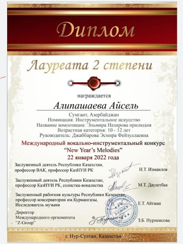 Sumqayıt Regional Mədəniyyət İdarəsinə tabe olan Səid Rüstəmova 3 saylı uşaq incəsənət məktəbinin 6-cı sinif şagirdləri Aysel Əlipaşayeva və Fidan Sultanova vokal instrumental “New years Melodies” beynəlxalq müsabiqəsində instrumental ifaçılıq üzrə 2-ci yerə layiq görülüblər.