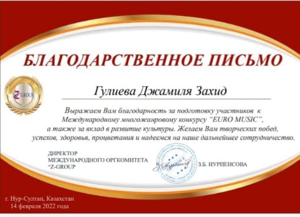 Sumqayıt Regional Mədəniyyət İdarəsinə tabe olan Xızı rayon nümayəndəliyinin Uşaq musiqi məktəbinin şagirdi beynəlxalq müsabiqədə uğur qazanıb. "Z-Group"un təşkilatçılığı ilə Nursultan şəhərində onlayn formatda keçirilən Beynəlxalq “EURO MUSIC" çoxjanrlı müsabiqədə 10-12 yaş arası kateqoriyasında məktəbin fortepiano ixtisası üzrə şagirdi Gülxanım Təyyar qızı Əzimzadə 2-ci dərəcəli Laureat adı ilə, müəllimi Cəmilə Zahid qızı Quliyeva isə təşəkkürnamə ilə təltif edilib.