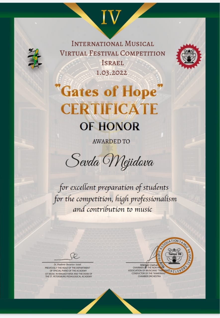 Sumqayıt Regional Mədəniyyət İdarəsinə tabe olan Qara Qarayev adına 1 nömrəli uşaq musiqi məktəbinin fortepiano ixtisası üzrə 6-cı sinif şagirdi Aytac Səxavət qızı Vəlizadə öz yaş kateqoriyasında Israildə onlayn formatda keçirilən “Ümid qapıları” adlı Beynəlxalq musiqi festivalında iştirak edib.