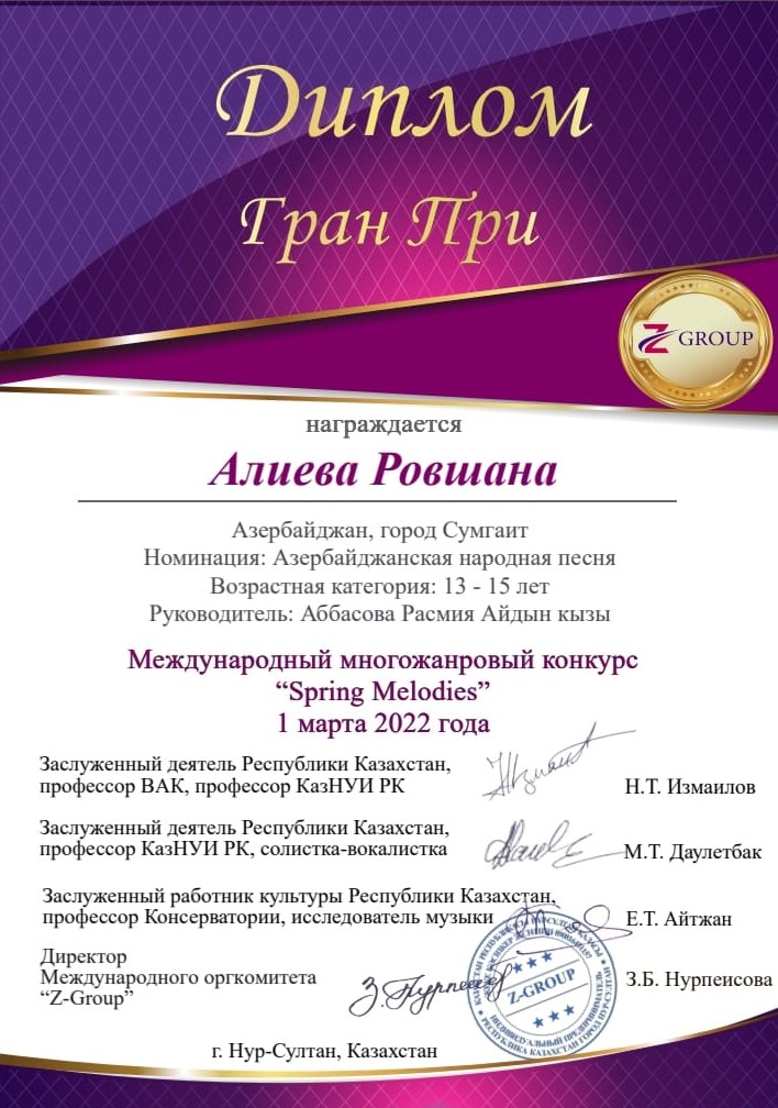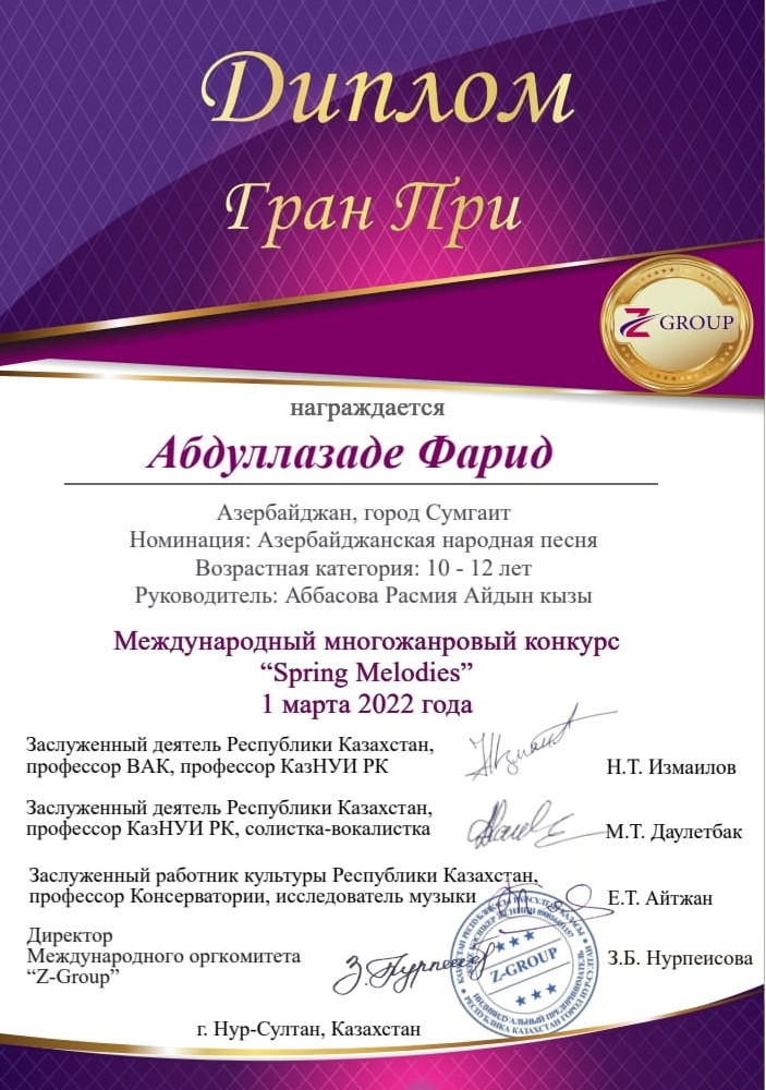 Sumqayıt Regional Mədəniyyət İdarəsinə tabe olan Səid Rüstəmov adına 3 nömrəli uşaq incəsənət məktəbinin xanəndə şöbəsinin 3-cü sinif şagirdi Kamran Sabir oğlu Babayev Qazaxıstan Respublikasının Nursultan şəhərində onlayn formatda keçirilən “Spring Melodies” Beynəlxalq çoxjanrlı müsabiqədə 1-ci dərəcəli Laureat, 3-cü sinif şagirdi Fərid Rəşad oğlu Abdullazadə və 4-cü sinif şagirdi Rövşanə Əhməd qızı Əliyeva isə Qran Pri mükafatına laiq görülüblər.