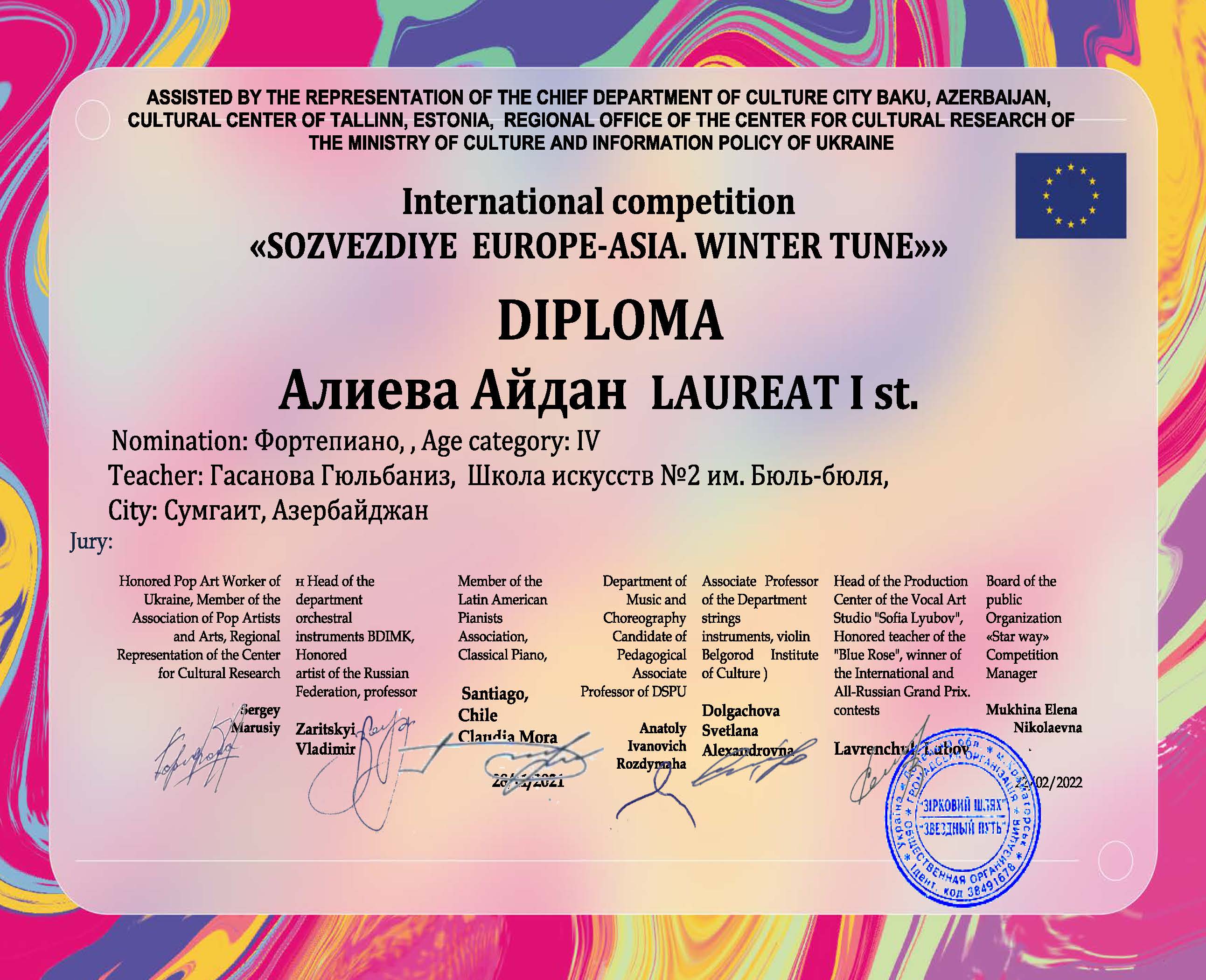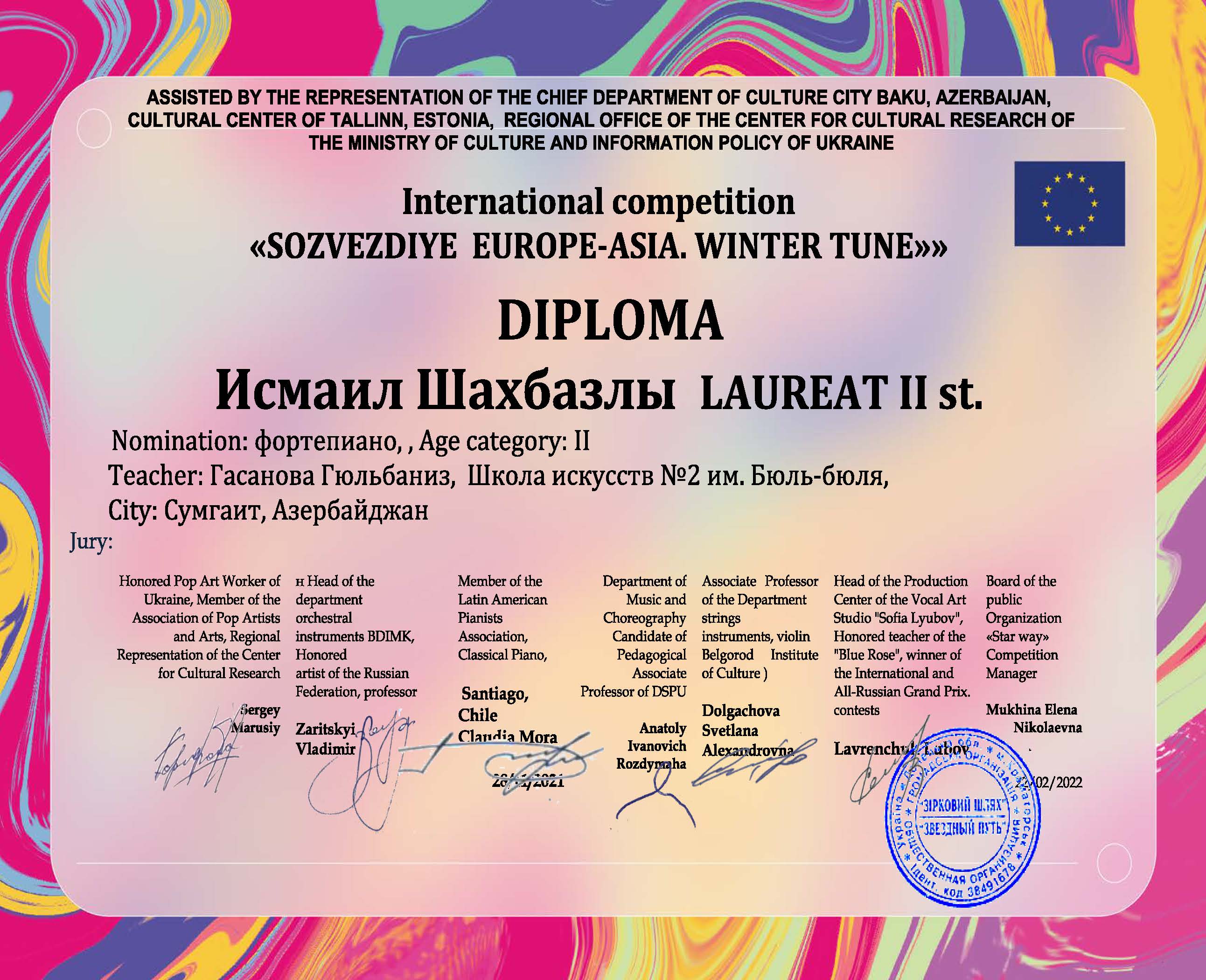 Sumqayıt Regional Mədəniyyət İdarəsinə tabe olan Bülbül adına 2 nömrəli uşaq incəsənət məktəbinin şagirdləri Aydan Əliyeva və İsmayıl Şahbazlı Belarusiyanın Minsk şəhərində onlayn formatda keçirilən “Sozvezdiye Evrope-Azia.Winter Tune” adlı Beynəlxalq musiqi festivalında nailiyyət qazanıblar.