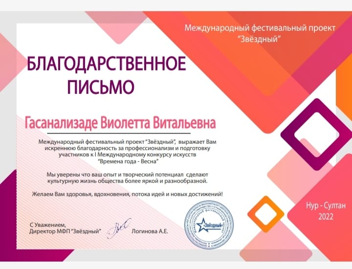 Sumqayıt Regional Mədəniyyət İdarəsinə tabe olan Səid Rüstəmov adına 3 nömrəli uşaq incəsənət məktəbinin skripka şöbəsinin 1-ci sinif şagirdi Zəhra Arif qızı Əlimətova Qazaxıstan Respublikasının Nur-Sultan şəhərində keçirilən “Vremena qoda-Vesna” 1-ci Beynəlxalq incəsənət müsabiqəsində 1-ci dərəcəli Laureat adını qazanaraq diplomla mükafatlandırılıb.