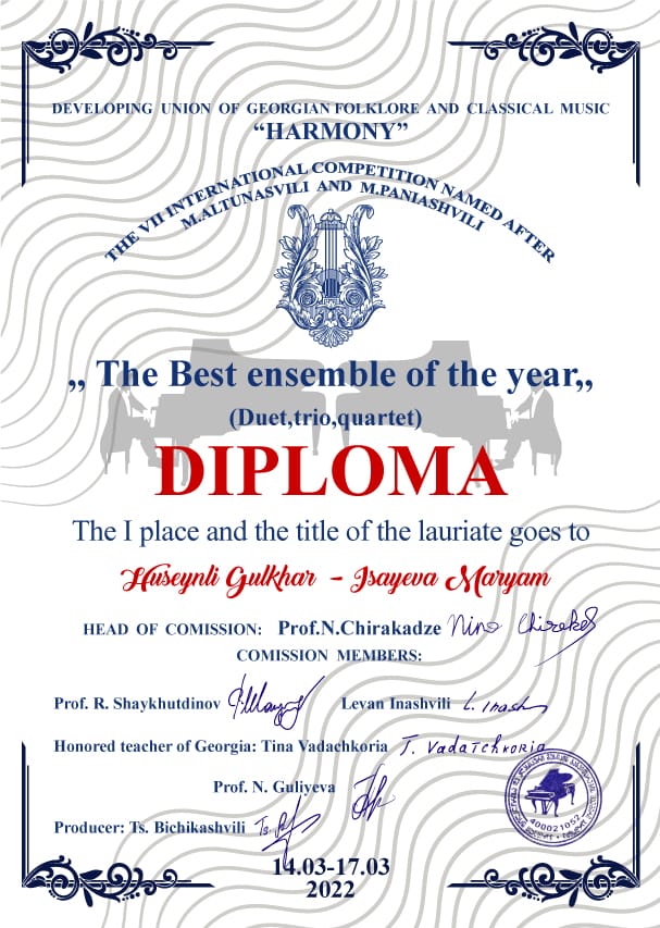 Sumqayıt Regional Mədəniyyət İdarəsinə tabe olan Səid Rüstəmov adına 3 nömrəli uşaq incəsənət məktəbinin fortepiano şöbəsinin 3-cü sinif şagirdi Gülxar Ramin qızı Hüseynli Gürcüstan Respublikasında onlayn formatda keçirilən M.Altunasvili və M.Panıaşvili adına 7-ci Beynəlxalq müsabiqədə 1-ci yerə layiq görülüb və diplomla təltif olunub.