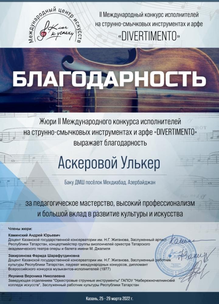 Sumqayıt Regional Mədəniyyət İdarəsinə tabe olan Abşeron rayon Mehdiabad qəsəbə uşaq musiqi məktəbinin skripka ixtisası üzrə 4-cü sinif şagirdi Ayan Quliyeva Tatarıstan Respublikasının Kazan şəhərində onlayn formatda keçirilən 2-ci Beynəlxalq “DIVERTIMENTO" müsabiqəsində 3-cü dərəcəli Laureat, müəllimi Əsgərova Ülkər isə təşəkkürnamə ilə təltif olunublar.