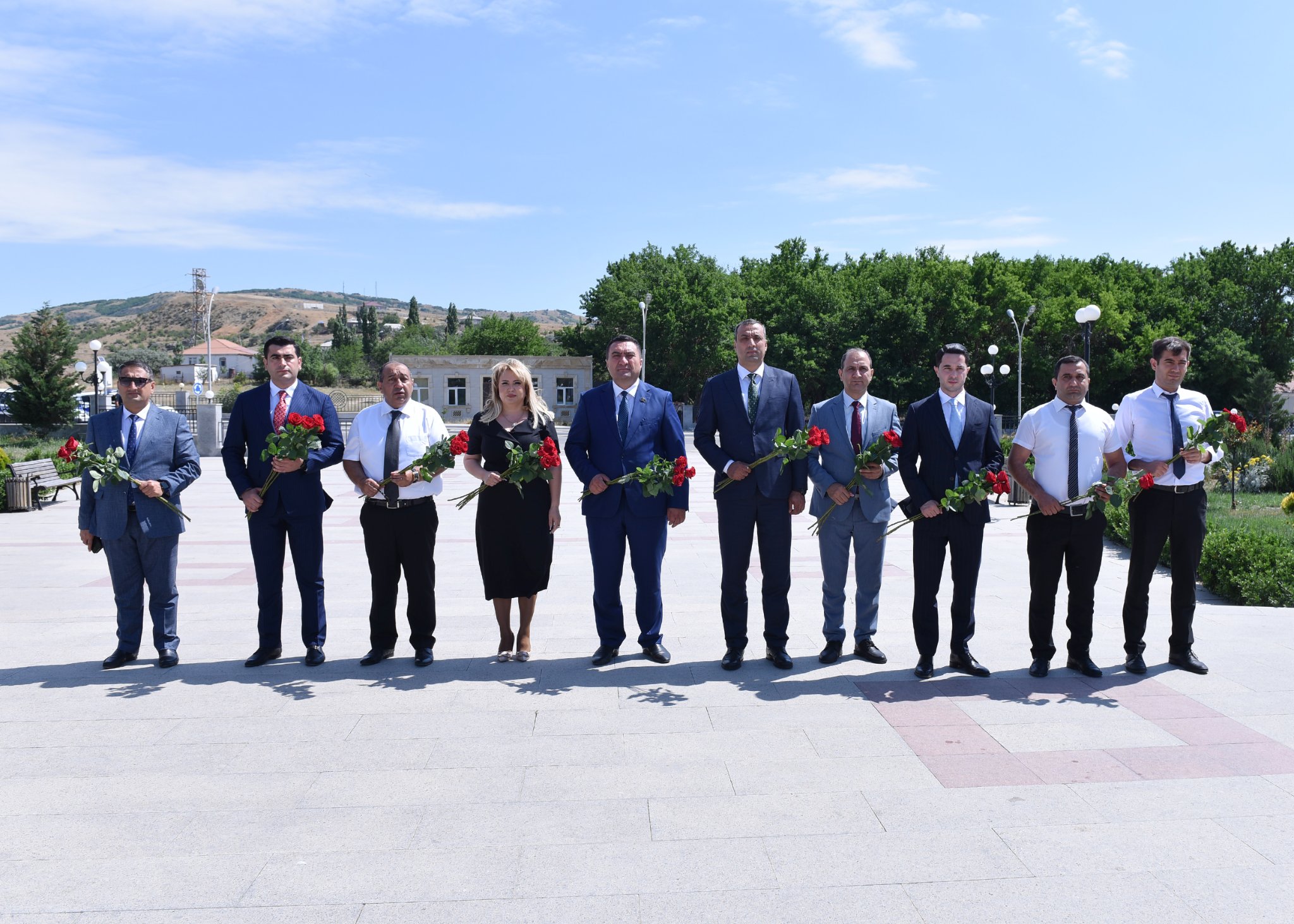 İlk növbədə tədbir iştirakçıları ulu öndər Heydər Əliyevin abidəsini ziyarət edərək, önünə gül dəstələri düzüblər.