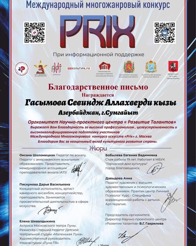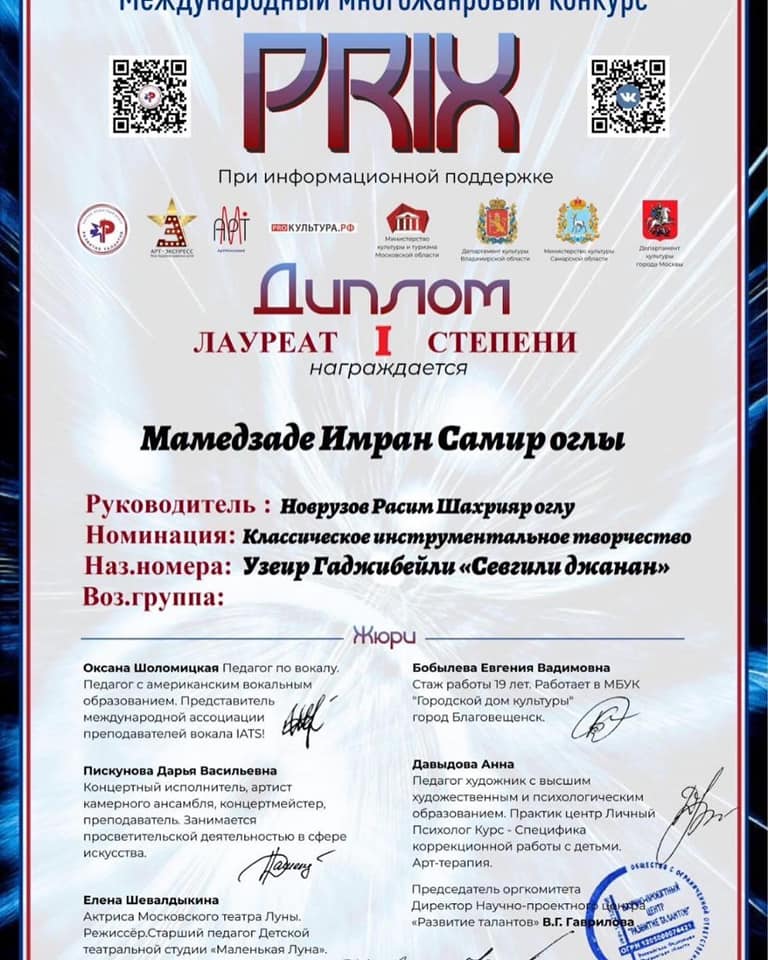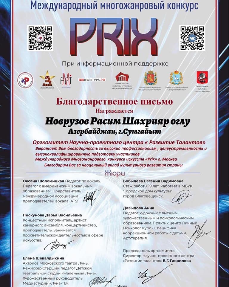 Sumqayıt Regional Mədəniyyət İdarəsinə tabeli Sumqayıt şəhər Bülbül adına 2 nömrəli Uşaq İncəsənət Məktəbinin 2-ci sinif şagirdi İmran Məmmədzadə Rusiyada keçirilən Beynəlxalq çoxjanrlı “Prix” müsabiqəsində birinci yerə layiq görülüb. Qeyd olunan müsabiqədə şagirdlərin müəllimi Rasim Novruzov və konsertmeysteri Sevinc Qasımova Təşəkkürnamə ilə mükafatlandırılıb.