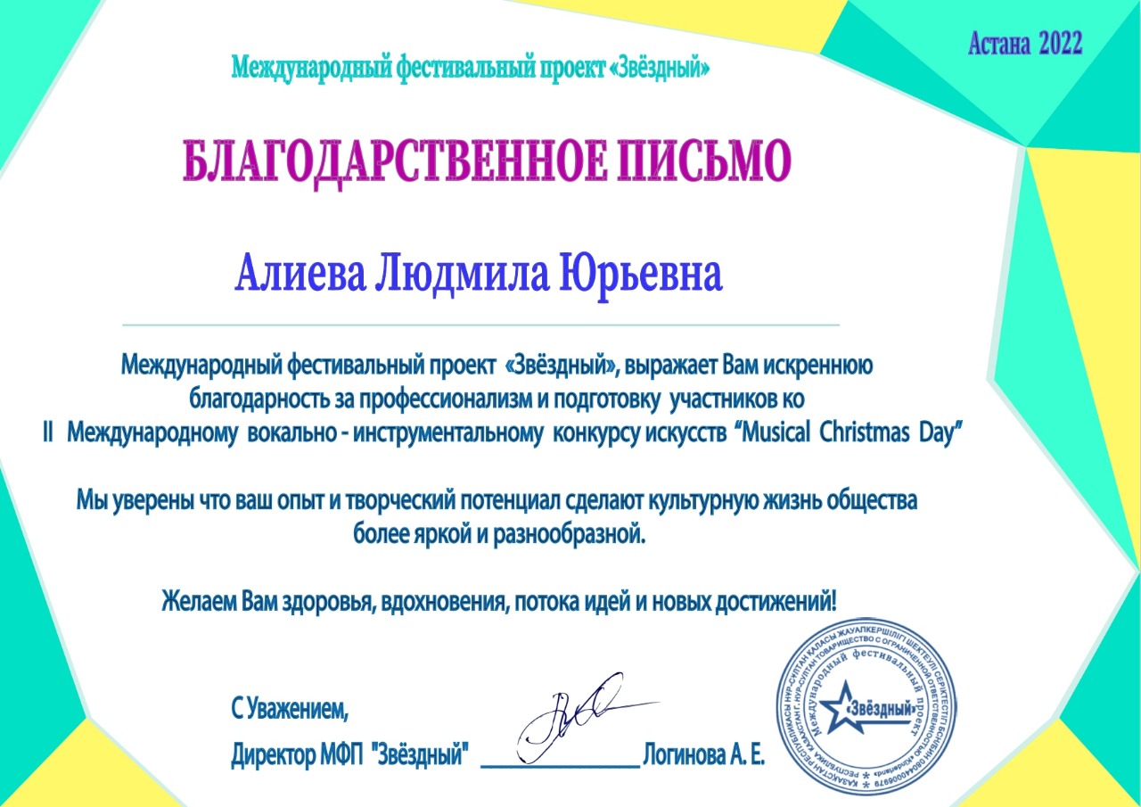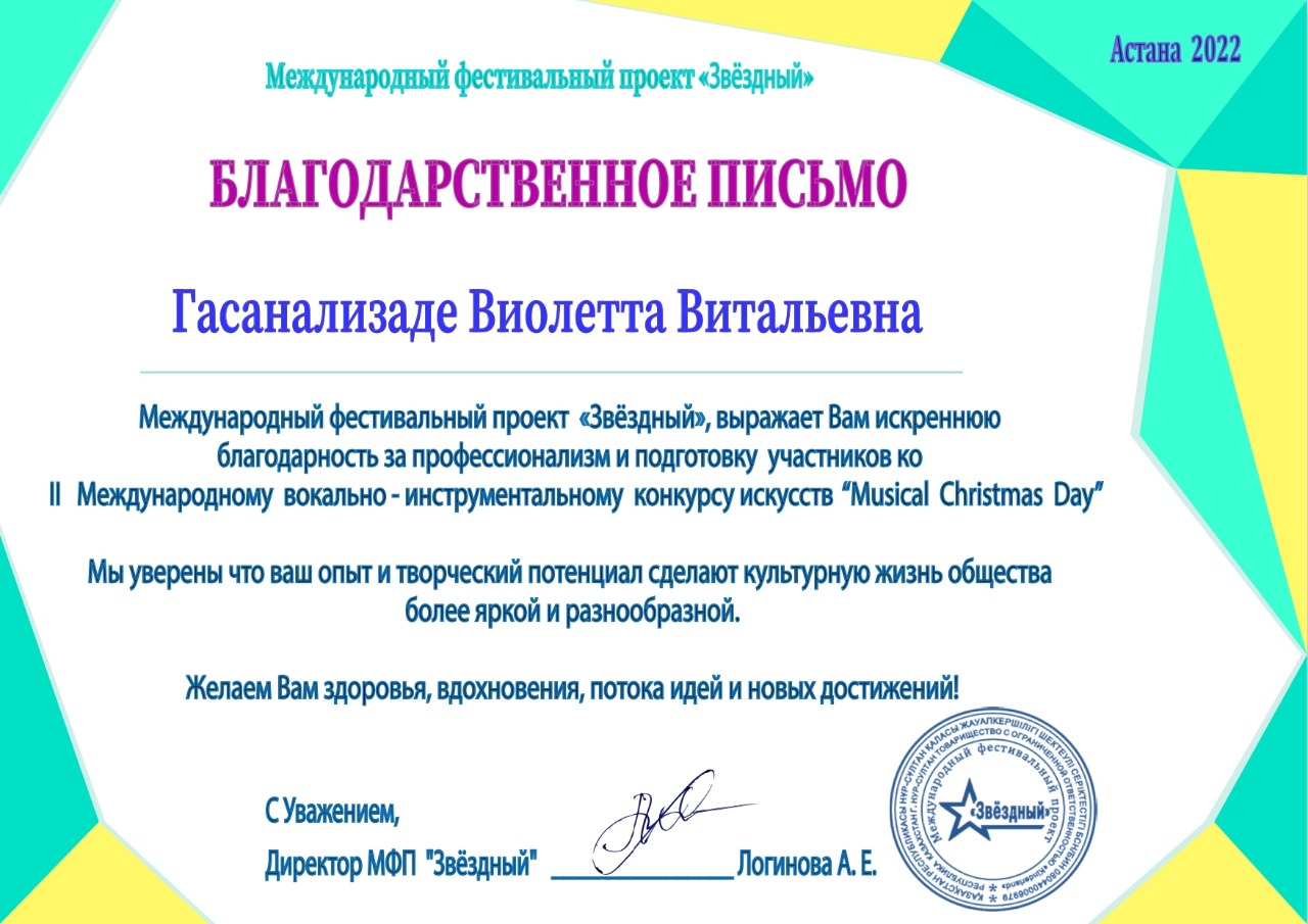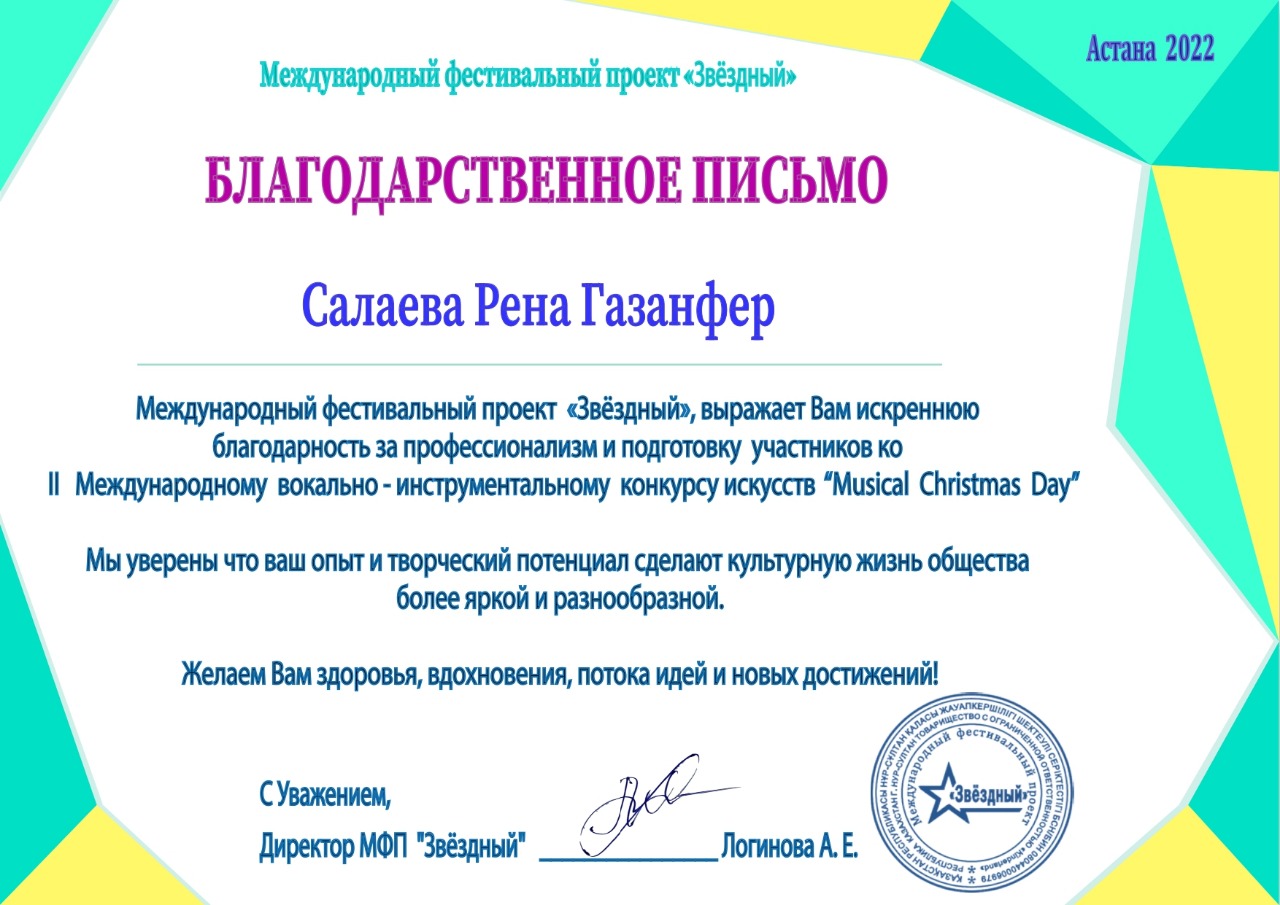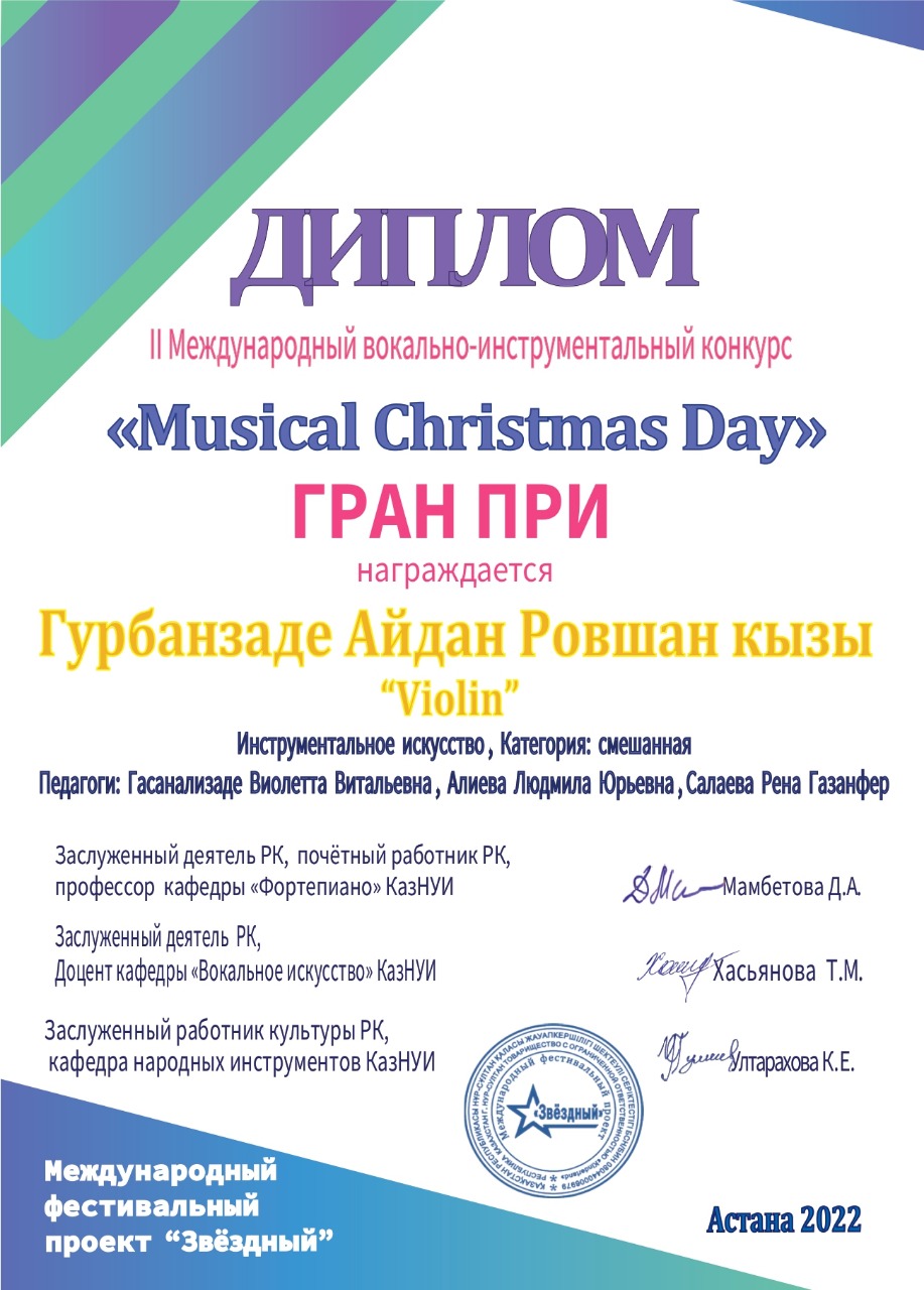 Sumqayıt Regional Mədəniyyət İdarəsinə tabeli S.Rüstəmov adına 3 nömrəli Uşaq İncəsənət Məktəbinin skripkaçalanlar ansamblı, skripka sinfinin şagirdləri Yeganə Xəqani qızı Səfərli, Aydan Rövşən qızı Qurbanzadə, Ayan Fuad qızı Abdullayeva, Mariya Fərid qızı Vəlibəyova, Ayşən Aqil qızı Hüseynova, Azər Araz oğlu Quliyev, Nuray Elnur qızı Məmmədova (müəllimlər: Lyudmila Əliyeva və Violetta Həsənəlizadə), fortepiano sinfinin şagirdi Nigar Əflatun qızı Mustafayeva 2022-ci il tarixində Qazaxıstan Respublikasının Astana şəhərində onlayn keçirilən II Beynəlxalq vokal – instrumental müsabiqəsində  Qran-Pri mükafatına layiq görülüblər.