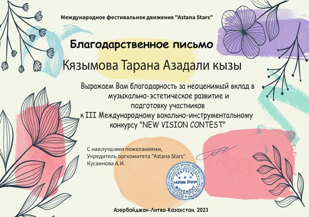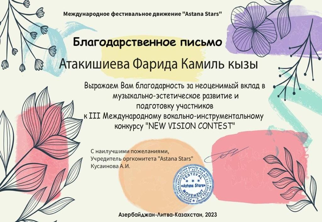 Sumqayıt Regional Mədəniyyət İdarəsinə tabeli Abşeron rayon Ceyranbatan qəsəbə Uşaq İncəsənət Məktəbinin Xor kollektivi Astana festival hərəkatının rəhbərliyi ilə onlayn keçirilən "New Vision Contest" III Beynəlxalq Vokal-İnstrumental müsabiqədə iştirak edərək, "Qran Pri" mükafatına layiq görülüblər. Şagirdləri müsabiqəyə xormeystr Fəridə Atakişiyeva hazırlayıb. Onları konsertmeyster Təranə Kazımova müşayiət edib.