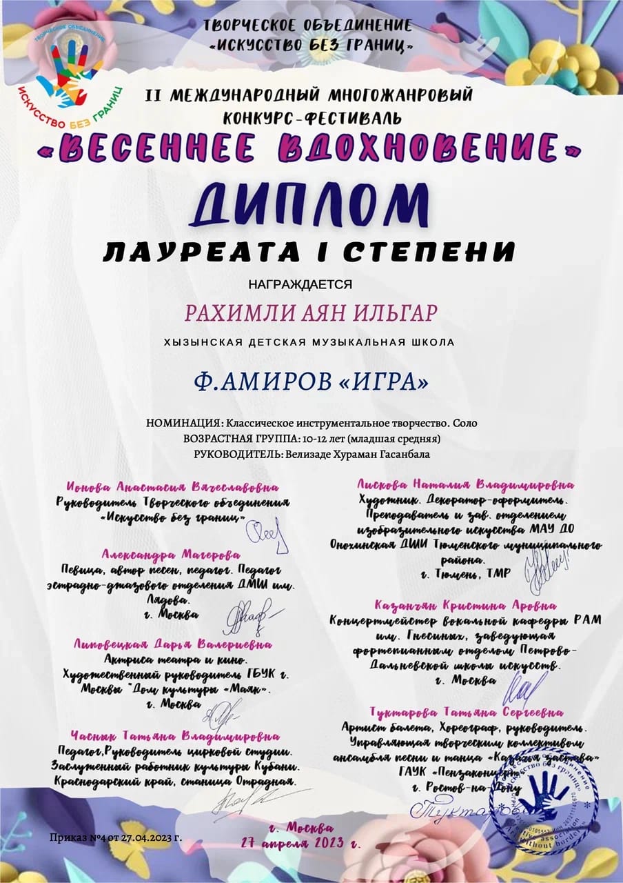 Rusiya Federasiyasının Moskva şəhərində "Sərhədsiz İncəsənət" Yaradıcılıq Birləşməsinin təşkilatçılığı ilə keçirilən II Beynəlxalq çoxjanrlı "Весеннее вдохновение" müsabiqə-festivalında Sumqayıt Regional Mədəniyyət İdarəsinə tabeli Xızı rayon Uşaq Musiqi Məktəbinin fortepiano ixtisası üzrə II sinif şagirdi Ayan İlqar qızı Rəhimli I dərəcəli Laureat adına layiq görülüb. Müəllimi Xuraman Vəlizadə Təşəkkürnamə ilə təltif edilib.