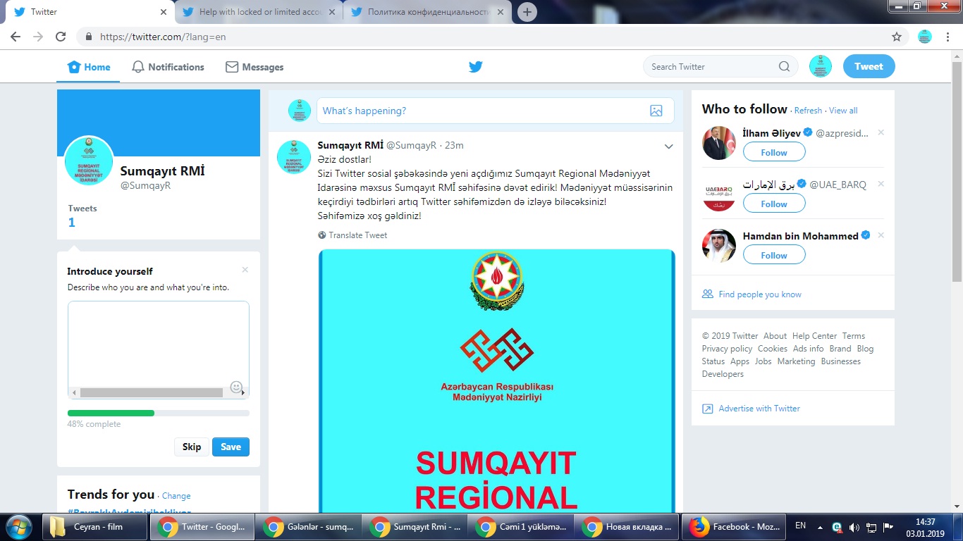 Sizi Twitter sosial şəbəkəsində yeni açdığımız Sumqayıt Regional Mədəniyyət Idarəsinə məxsus Sumqayıt RMĪ səhifəsinə dəvət edirik!