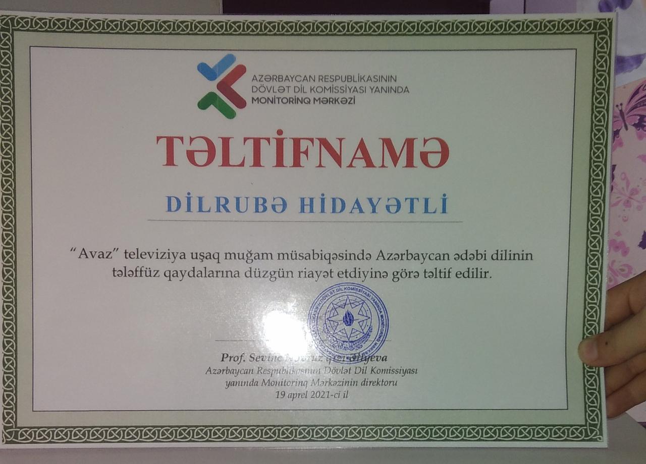 Dilrubə Hidayətli eyni zamanda bu müsabiqədə Azərbaycan ədəbi dilinin tələffüz qaydalarına düzgün riayət etdiyinə görə Təltifnamə ilə mükafatlandırılıb.
